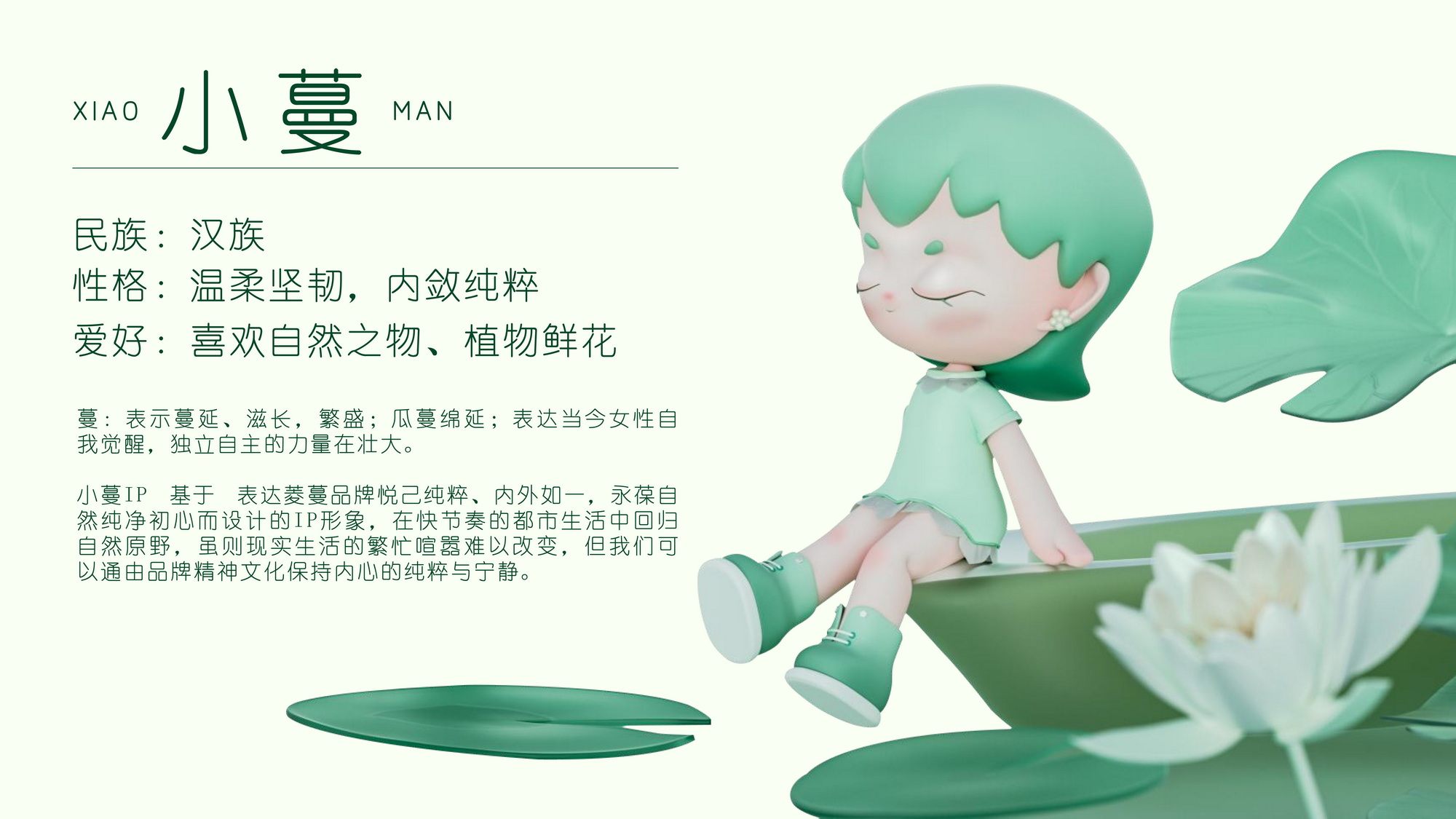 The inspiration draws from elements such as lotus flowers, green leaves, rippling water, a young girl, and blossoms. Among these, the lotus symbolizes the brand's botanical identity, while water waves represent purity and nourishment. The young girl embodies the brand's ethos of self-care, authenticity, and an unwavering commitment to natural purity. The color green signifies nature, vitality, and wellness. By weaving these elements together, we have crafted a harmonious and multifaceted image that blends Eastern culture with the essence of nature. This character aims to showcase the unique charm of a skincare brand rooted in purity and natural harmony to a broader audience.